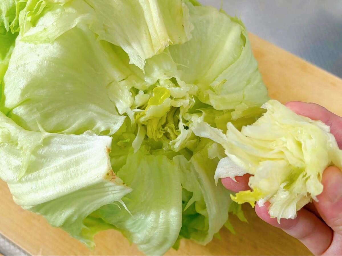 レタスの芯を取り除きます。動画内で紹介されていたやり方では、芯をグッと押し込んでから捻っていました。