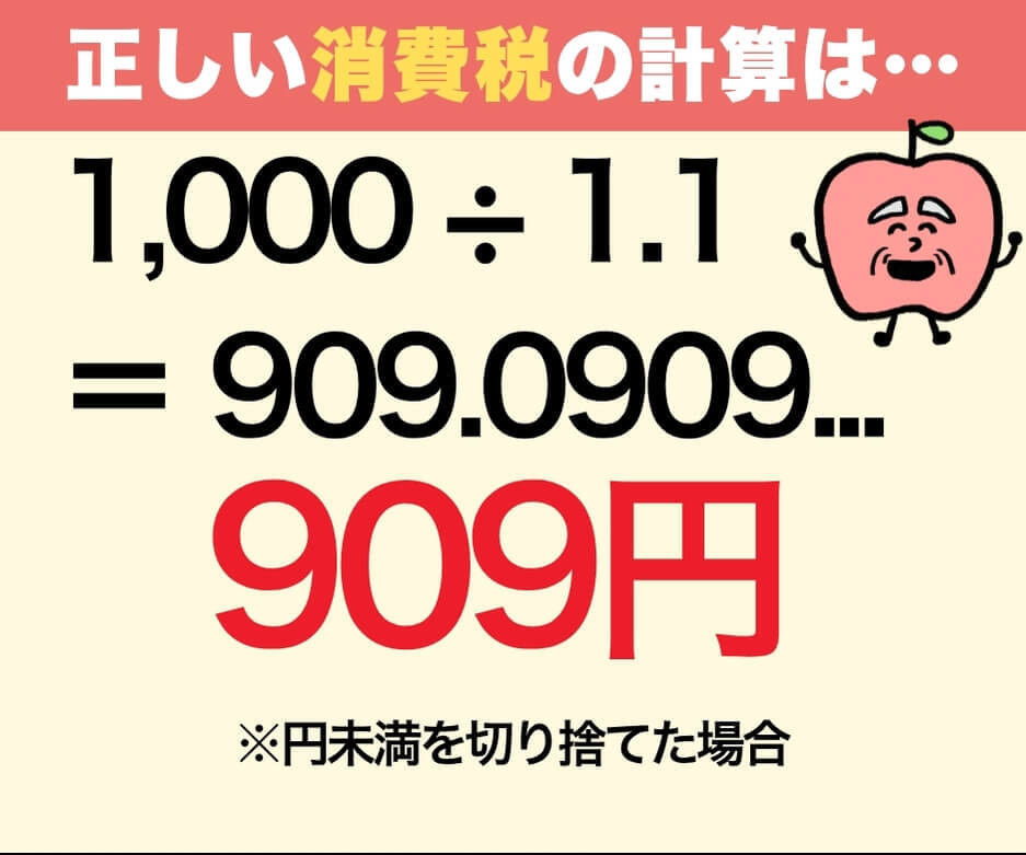 消費税は「元の価格(税抜き価格)」に対して10%が上乗せされるもの。 1,000円という数字はすでに「110%」の状態になっています。
