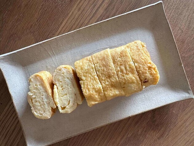見た目は普通の卵焼き。自分で作っておきながら、卵1個でいつもと同じビジュアルになったことにびっくり……(笑)。