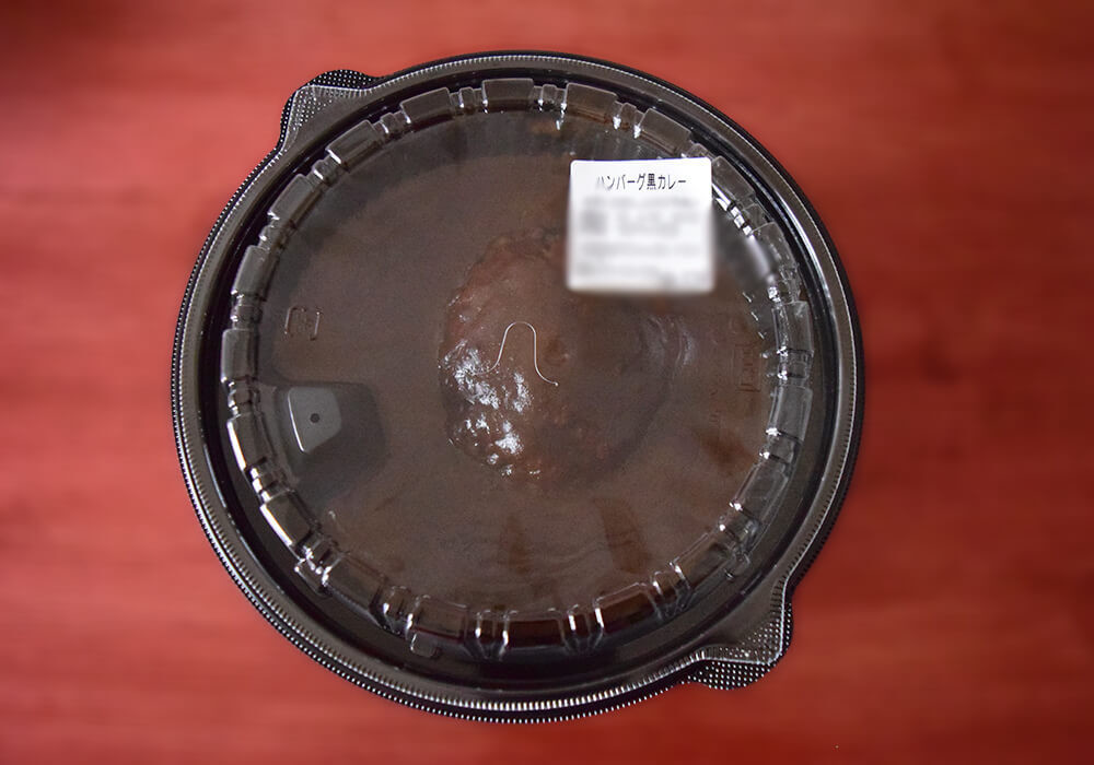 容器の上段には、とろりとした黒色のカレールーと分厚いハンバーグがのっており、下段にはごはんが入っています。