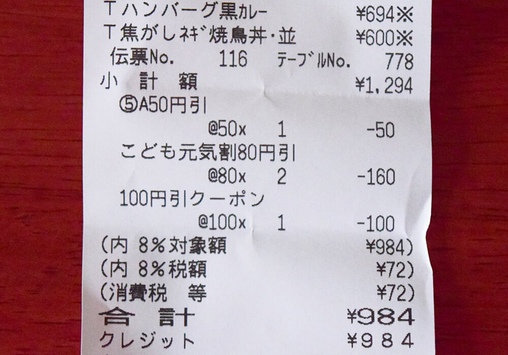 今回は「焦がしねぎ焼き鳥丼」と「ハンバーグ黒カレー」を購入しましたが、アプリのクーポンや、2026年3月2日(月)4時~4月20日(月)15時まで実施されている「こども元気割」80円(税込)引きキャンペーンなどの割引を駆使することで、通常価格より310円(税込)安く購入できました。