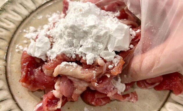 豚こま切れ肉に調味料をもみ込んで下味をつけます。