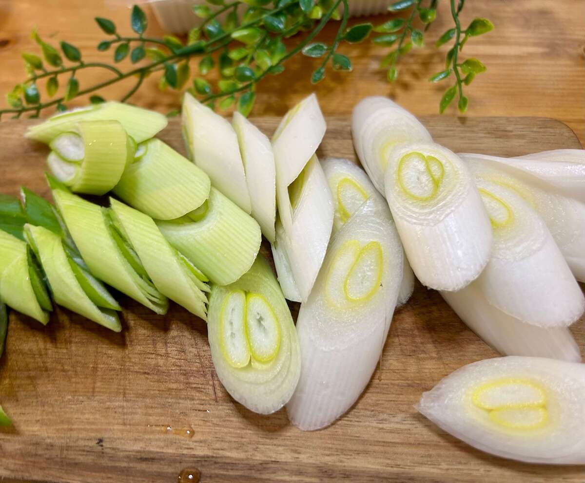 作り方①長ねぎは斜め薄切りにする