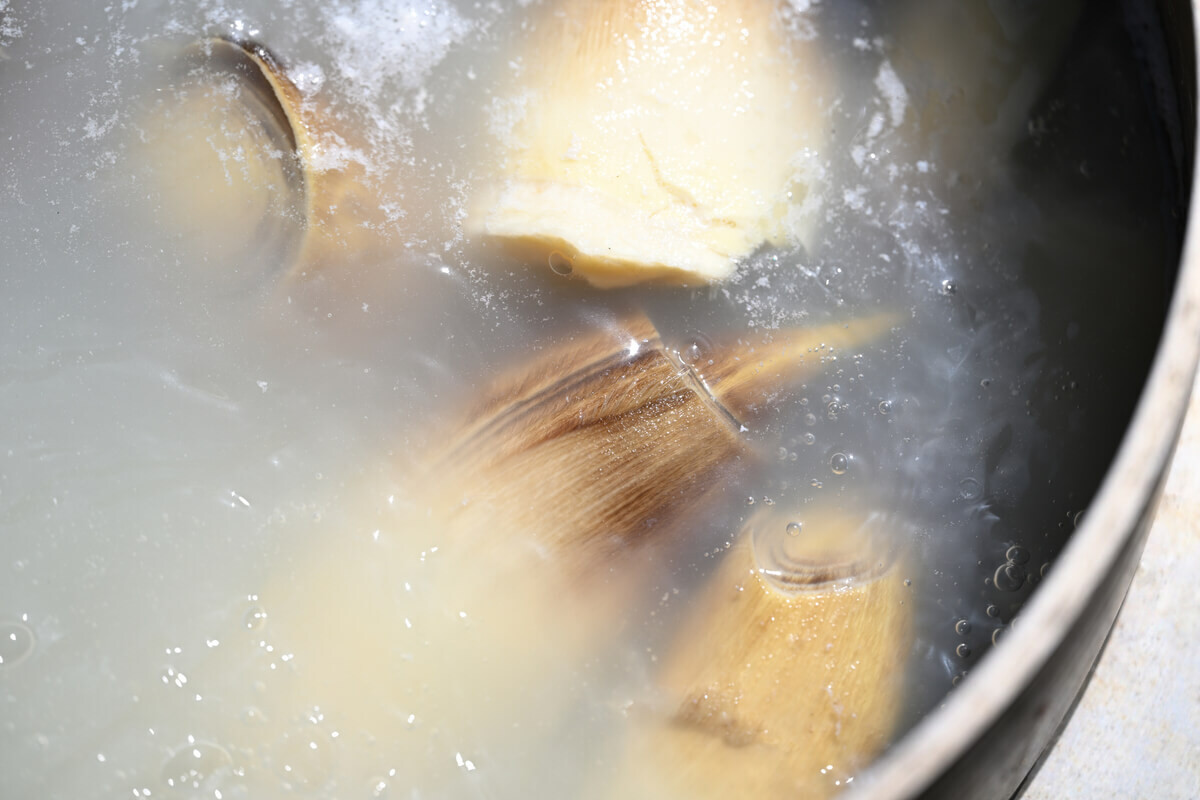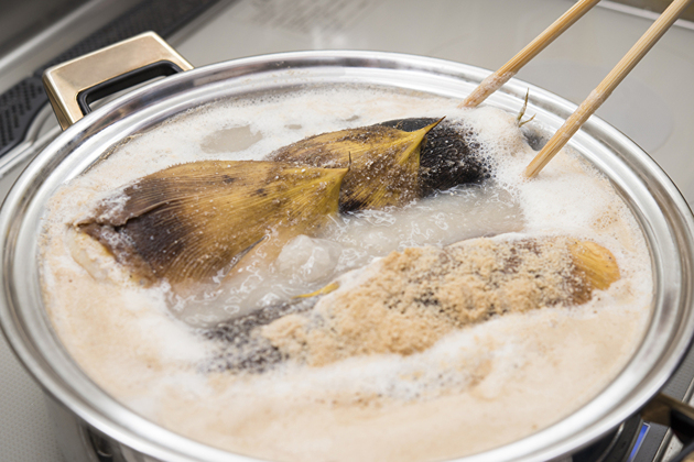 米ぬかに含まれる成分がアクを吸着し、茹で汁に流れ出たえぐみがたけのこに戻るのを防いでくれます。また、脂肪分がたけのこをコーティングして酸化を防いでくれます。