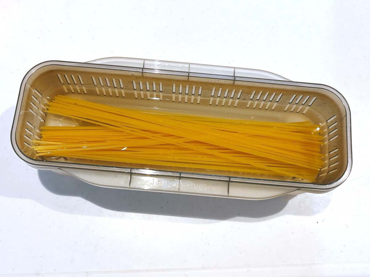 今回は、1人分茹でるために鍋を使うのが面倒くさかったので(笑)、スリーコインズのパスタ調理器を使用しました。