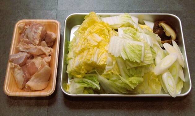 白菜は葉の部分をざく切りに、芯の部分はそぎ切りにして下さい。長ねぎ1/2本は斜め切りにし、しいたけも食べやすい大きさにカットします。