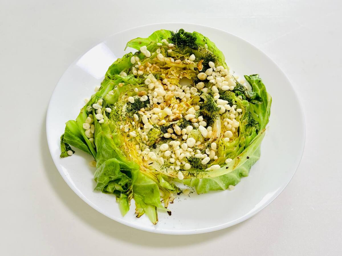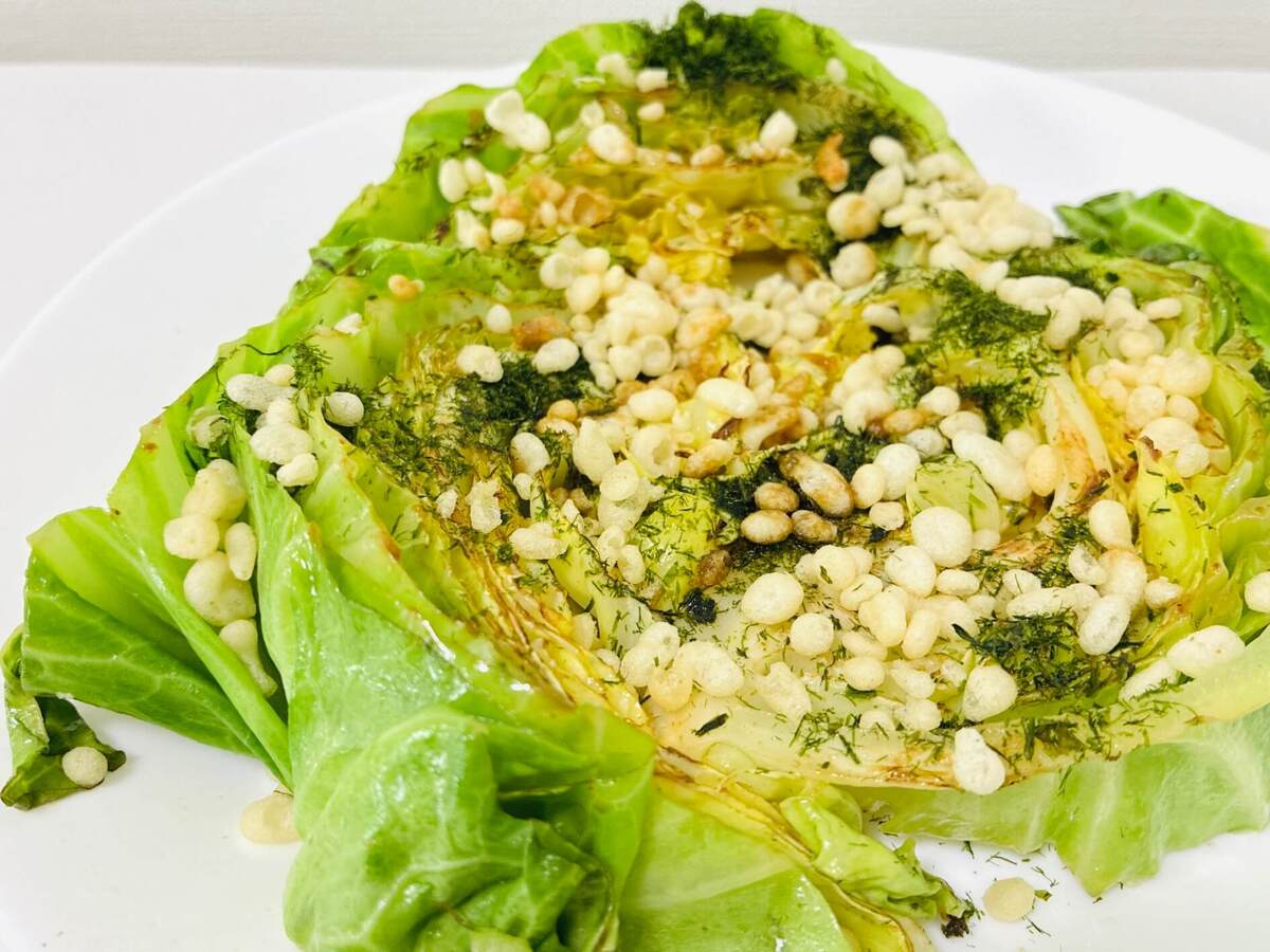 焼いた春キャベツをお皿に盛り付け、