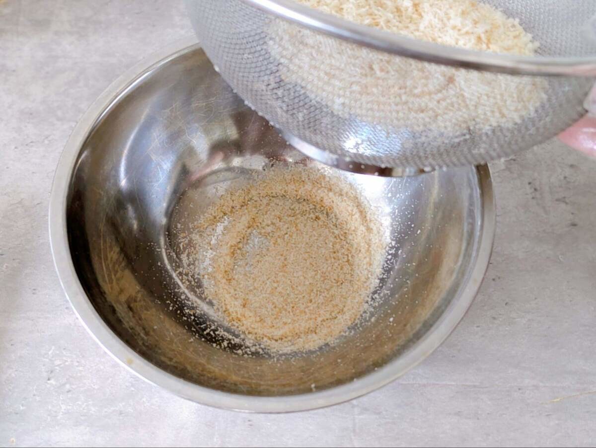 ボウルにザルを重ねてパン粉を入れ、手や麺棒でつぶしながらこします。パン粉を細かくすることで、油の吸収量を減らすことができるそうです。