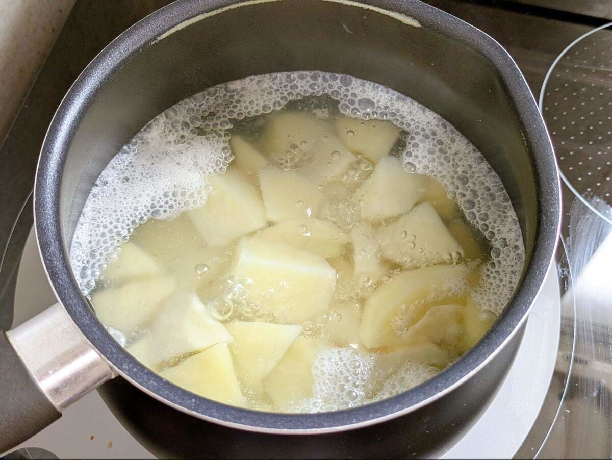 じゃがいもは一口大に切って鍋に入れます。じゃがいもがかぶるくらいまで水を入れて塩を加え、火にかけます。