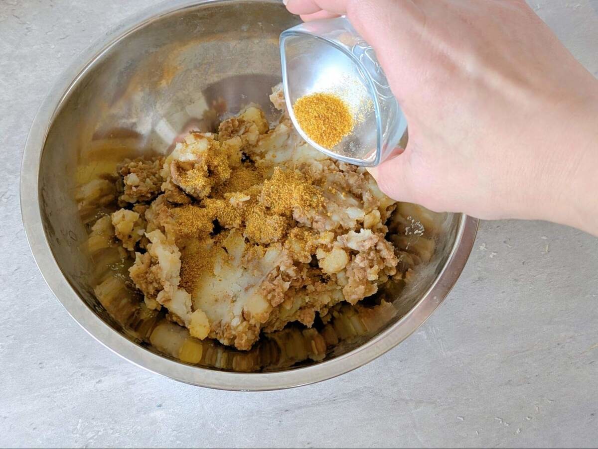 今回はじめて市販の炒めたまねぎを使ったのですが、こんなに便利な商品があったとは……!たまねぎをみじん切りにして炒める工程が省けるので、かなり楽できます。