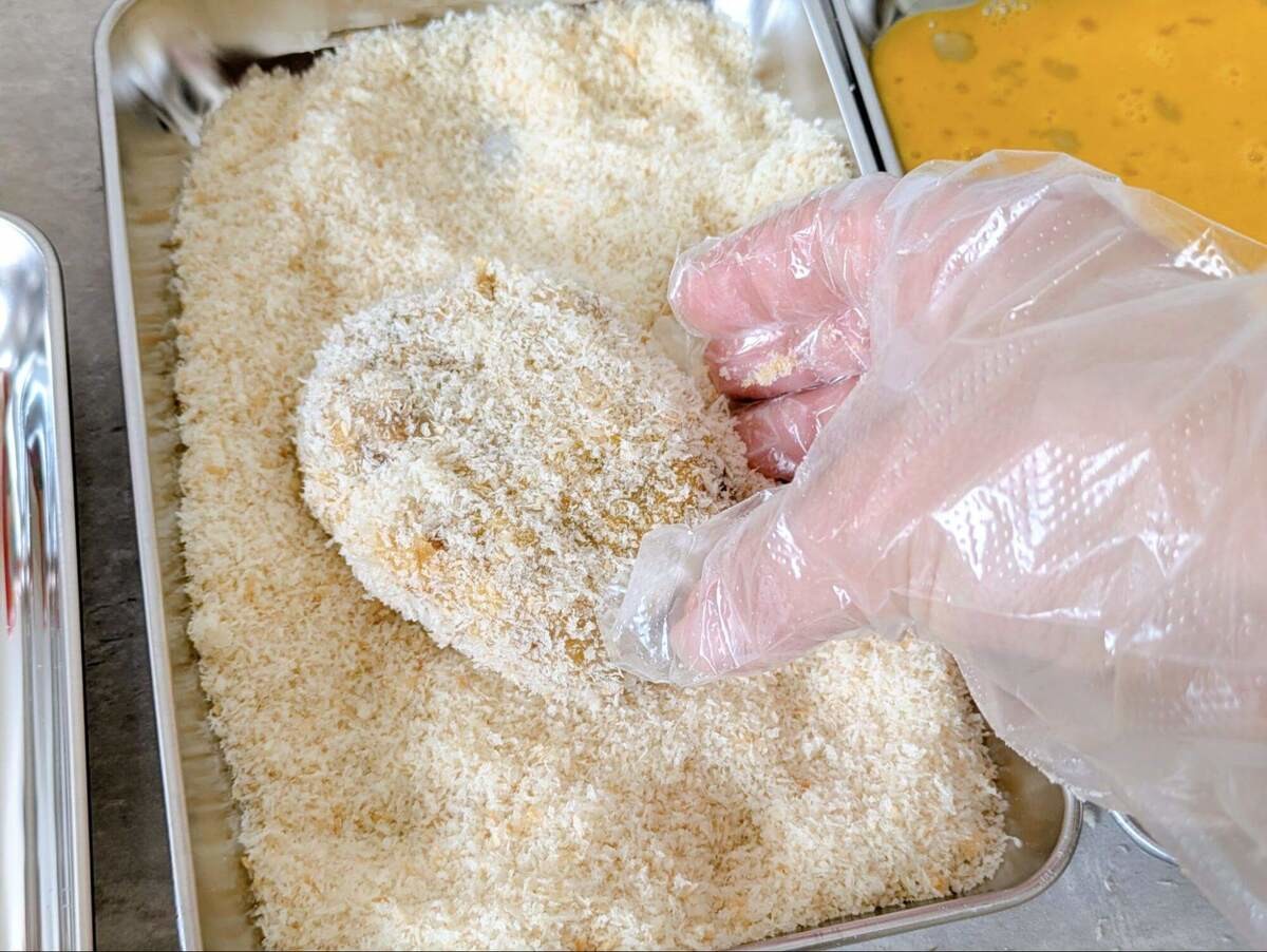 小麦粉をまぶして溶き卵にくぐらせ、②のパン粉を軽く押しつけるようにまぶしましょう。