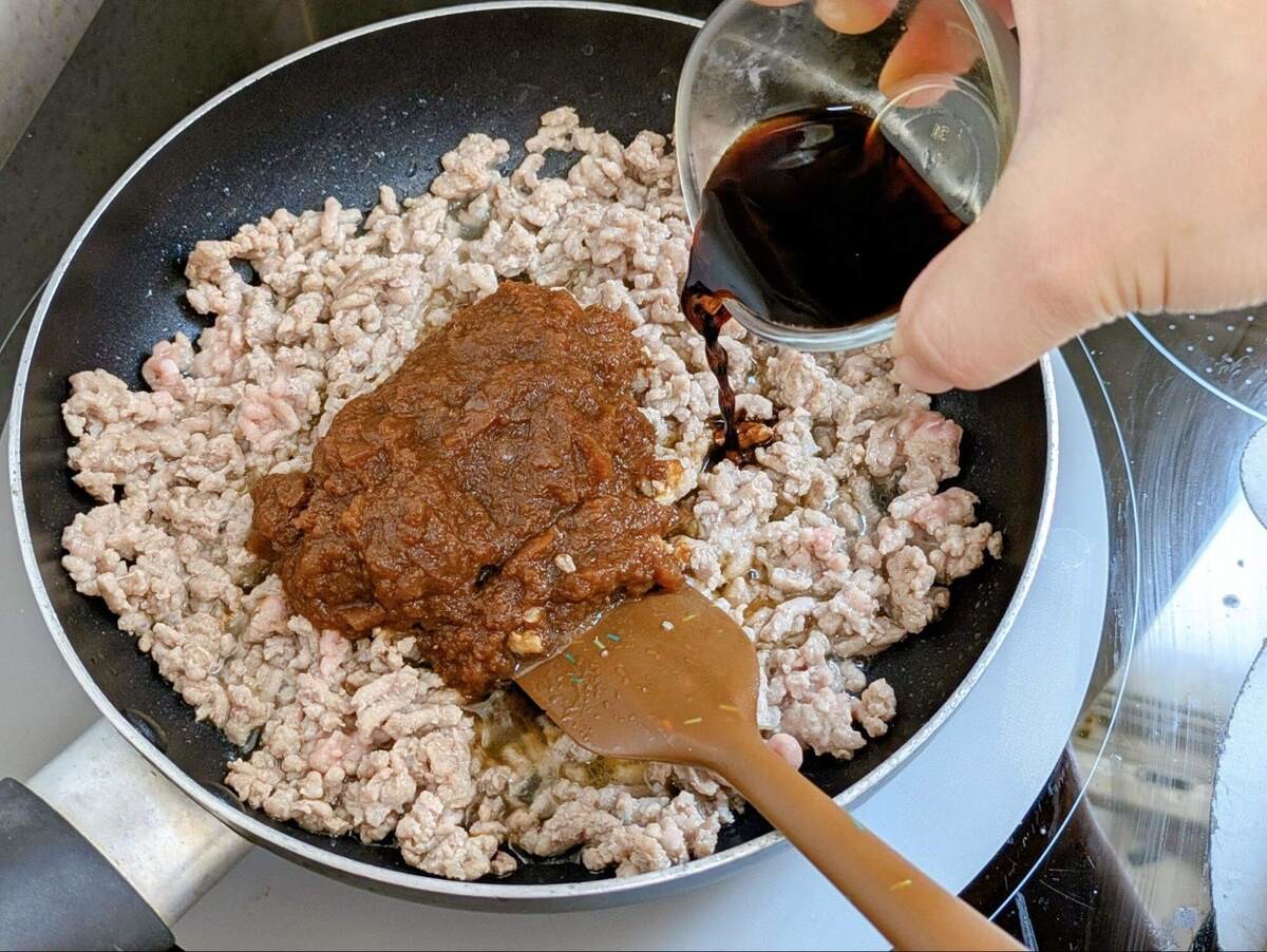 フライパンに米油を中火で熱し、豚ひき肉を炒めましょう。色が変わったら炒めたまねぎと【A】を加えて火を強め、汁気を飛ばしながら炒めます。