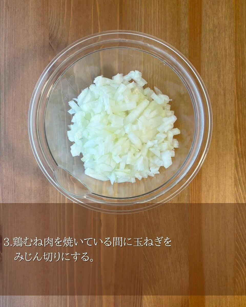 鶏むね肉を焼いている間に、玉ねぎをみじん切りにします。