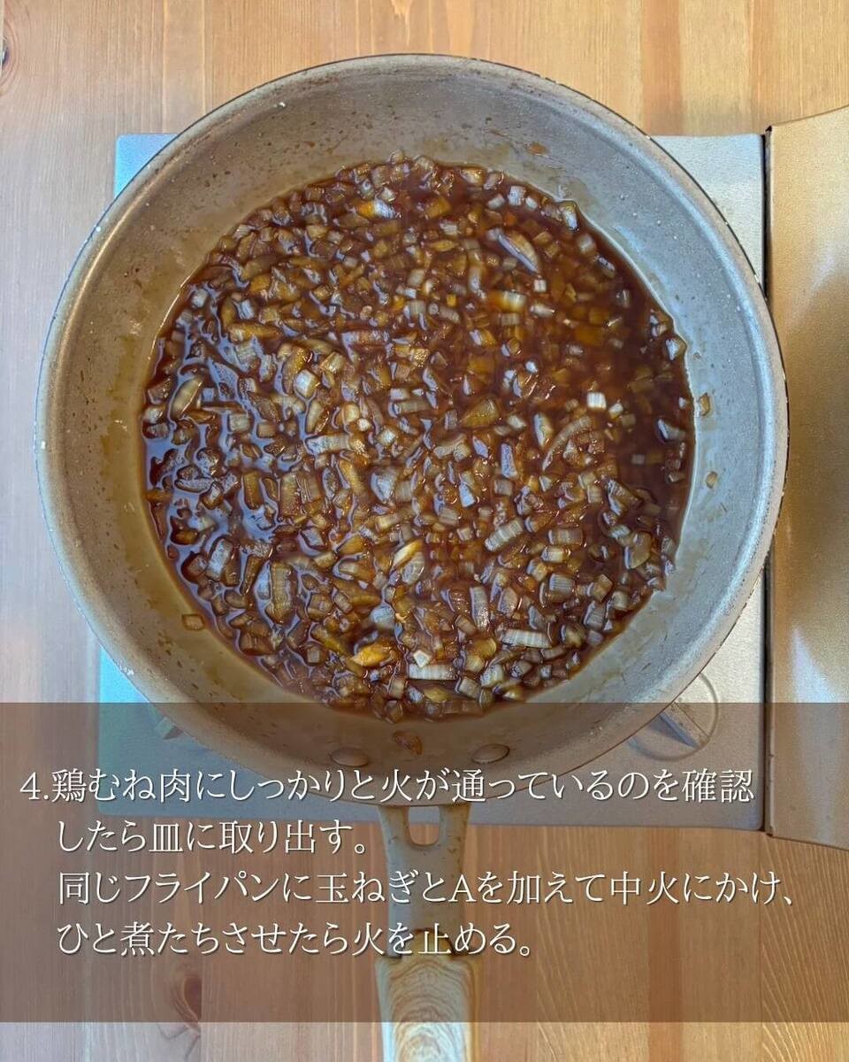 その後、同じフライパンに作り方③でカットした玉ねぎと【A】を入れ、中火でひと煮たちさせたら火を止めます。