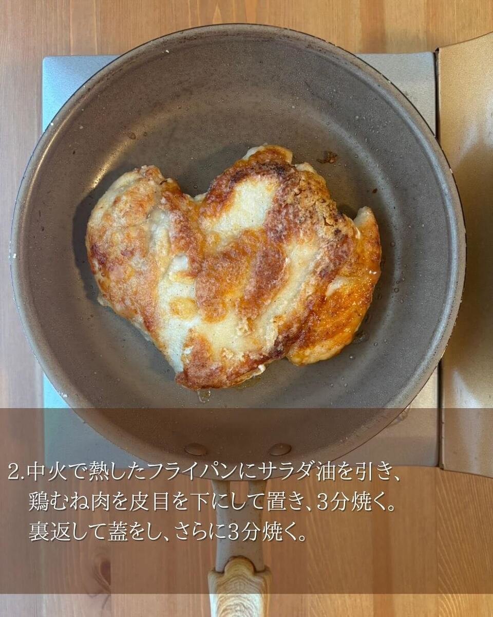 中火で熱したフライパンにサラダ油を引き、鶏むね肉の皮目を下に置いて3分間焼きましょう。