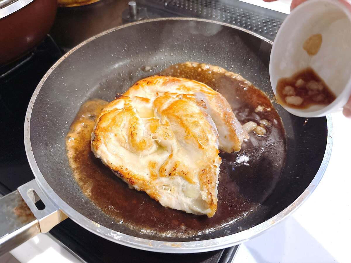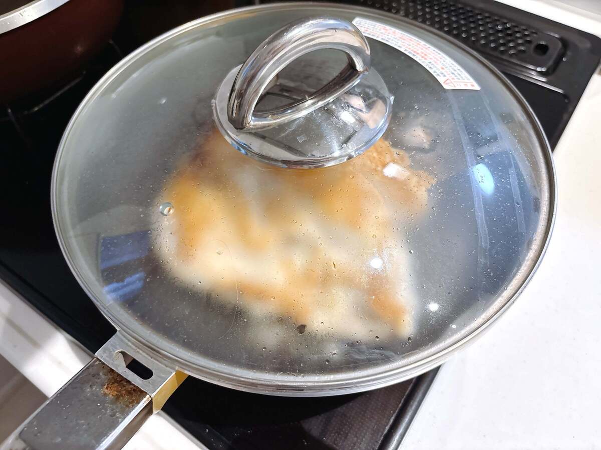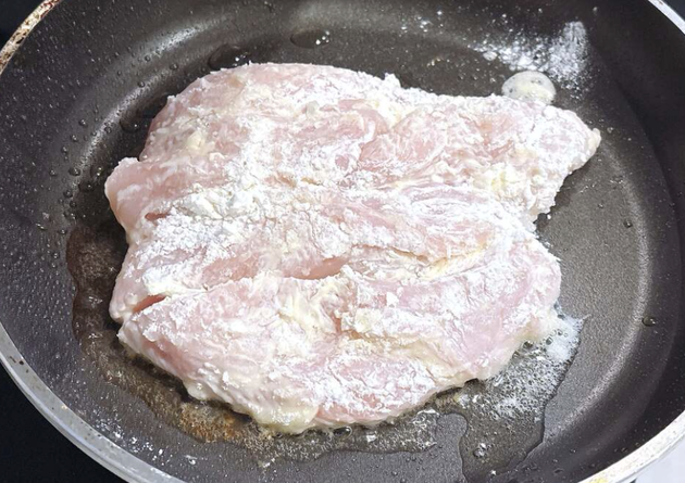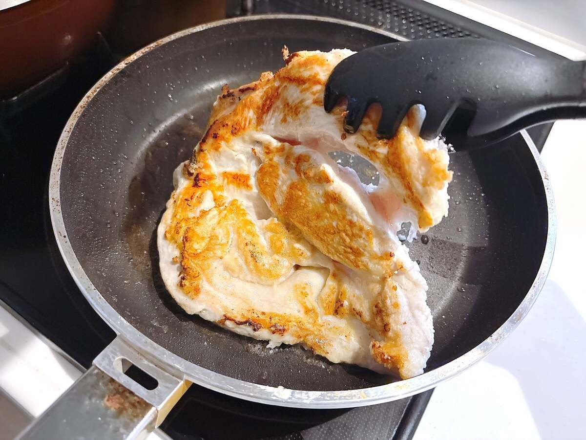 3分ほど焼いたら、鶏むね肉を裏返し……