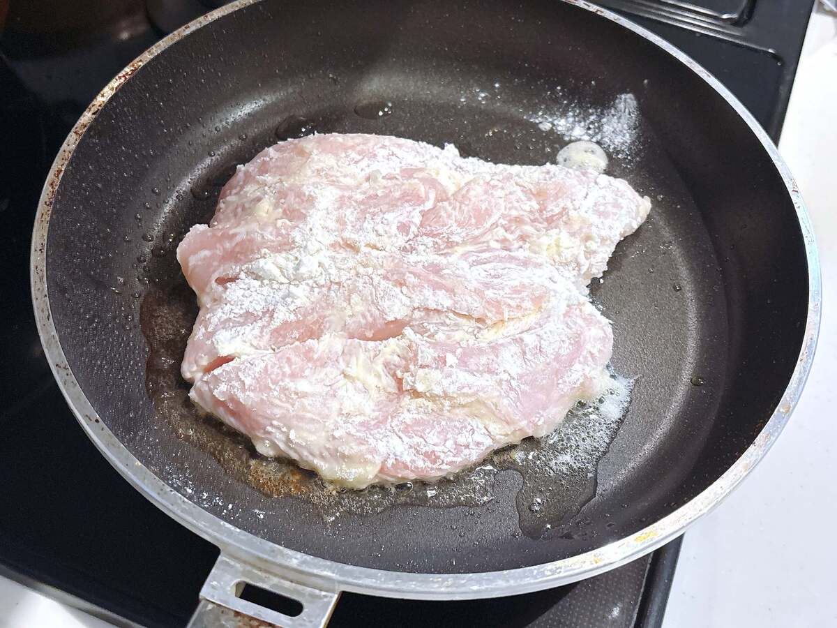 フライパンに油をひいて中火で熱し、鶏むね肉を焼きます。このとき、皮目は下にするのがポイントです。
