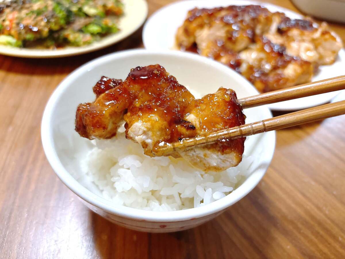 独特のパサパサ感はまったくなくて、甘辛いたれがよく絡みます。にんにくの風味と、黒こしょうのピリリとしたアクセントがクセになります。
