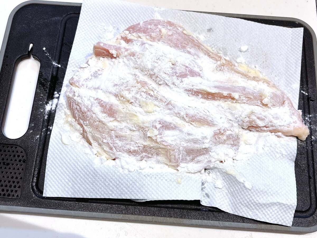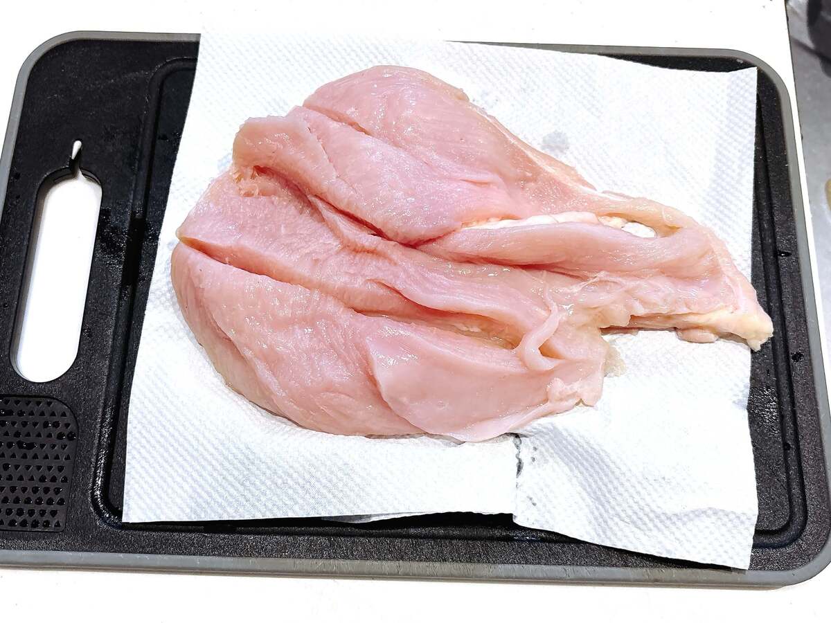 鶏むね肉を観音開きにして、室温に置いておきます。10分ほど置いたら、キッチンペーパーで余分な水分を拭き取りましょう。