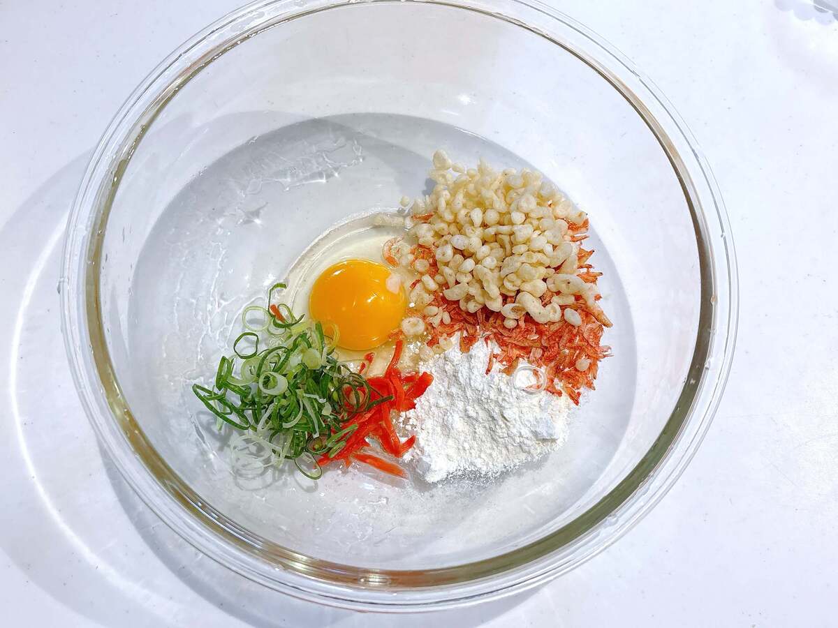 まずは【A】の材料全て、卵・お好み焼き粉・天かす・乾燥小エビ・紅ショウガ・きざみ青ネギを入れて混ぜて……