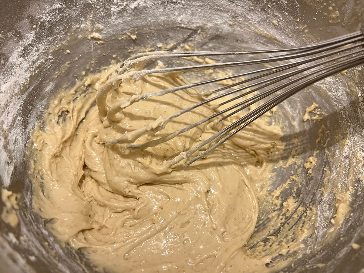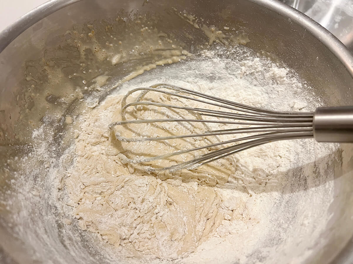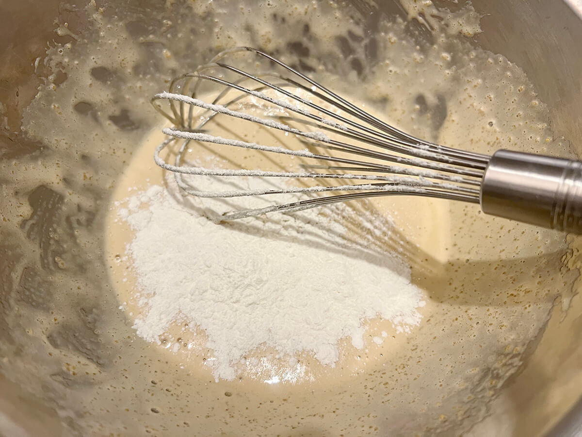 ふるった薄力粉を2〜3回に分けて加え、泡立て器で混ぜ込んでいきましょう。