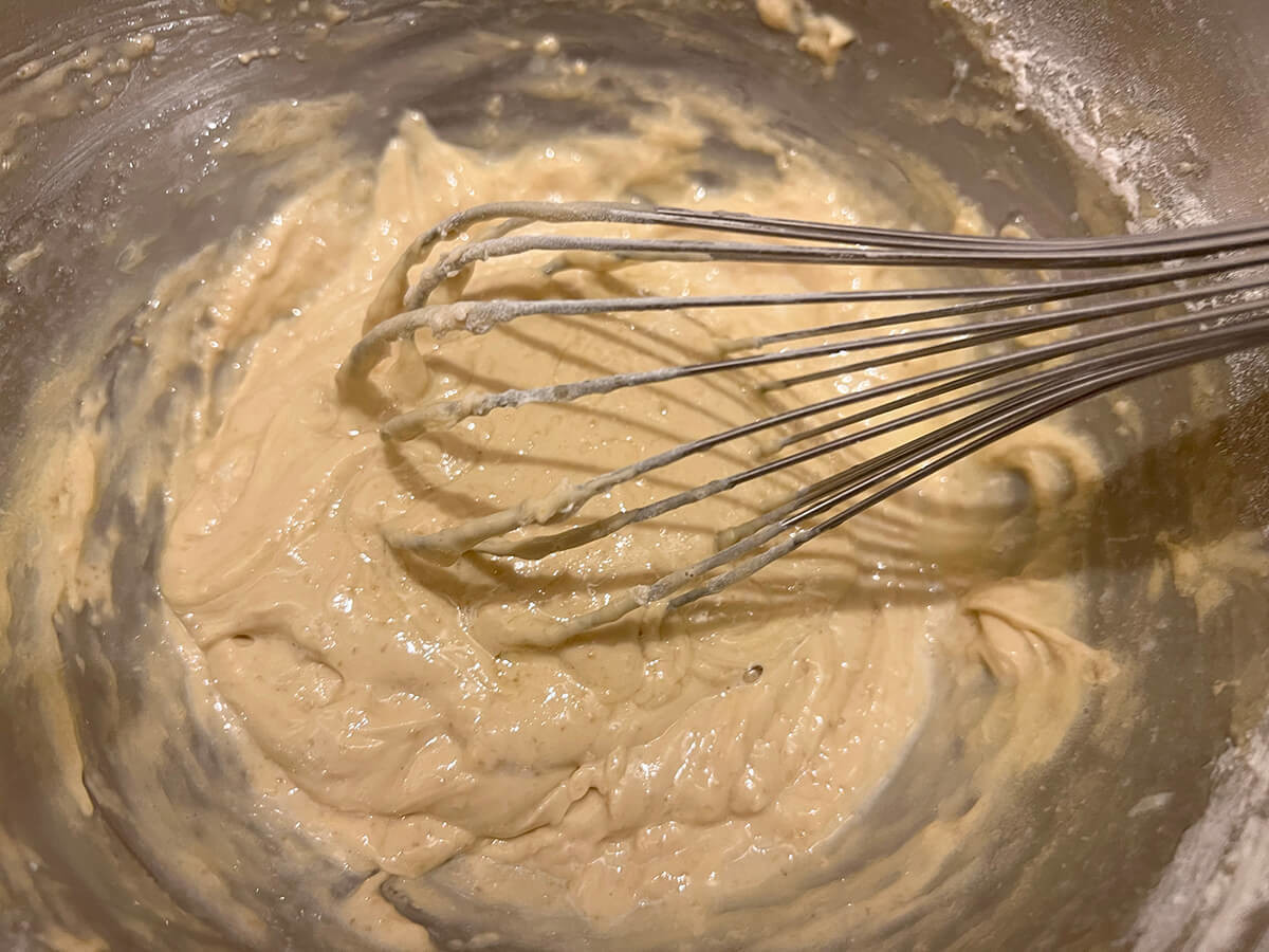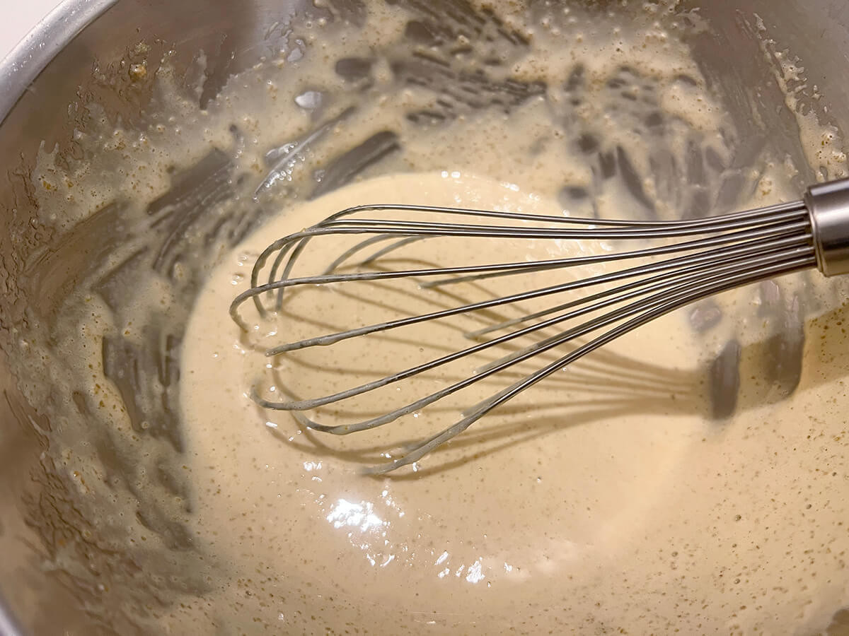 ここに溶かしバターも入れていきます。一度に入れず、数回に分けて泡立て器でかき混ぜながら全量混ぜ込んでいきましょう。これでケーキのアパレイユ(タネ)は完成です。