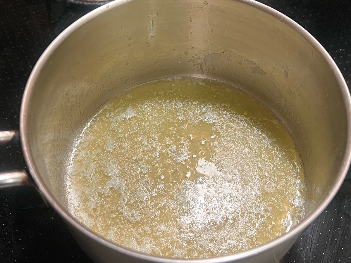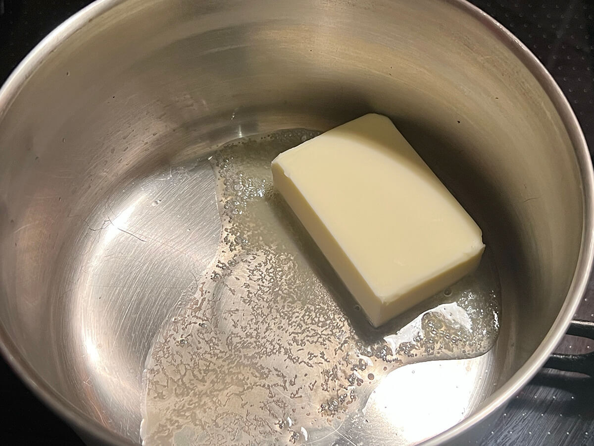 バターは溶かしバターにしておきます。弱火でゆっくり溶かしましょう。