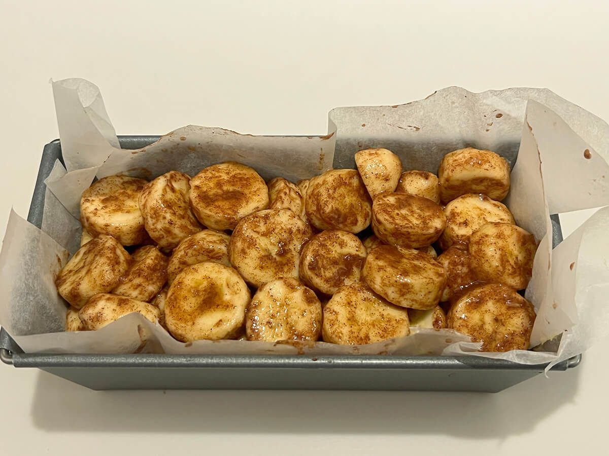マリネしたバナナをその上に並べていきます。ぎゅうぎゅうに詰め込んで、余ったら2段に重ねて全量のせていきます。バナナをマリネしていた液体も上からかけておきましょう。