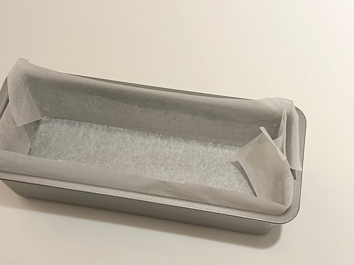 ケーキ型にオーブンペーパーを敷いておきましょう。