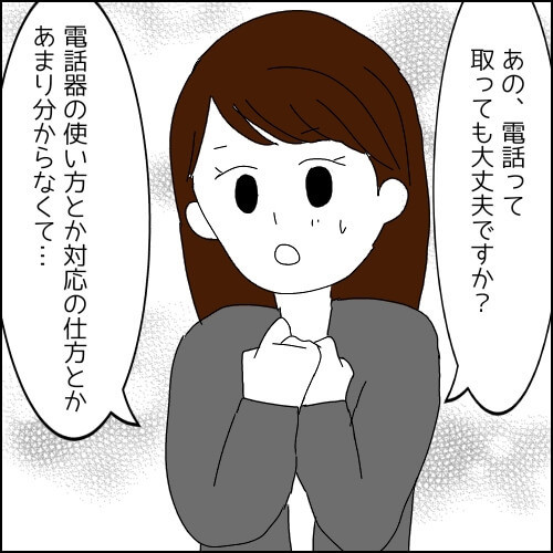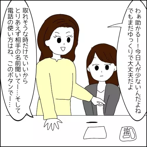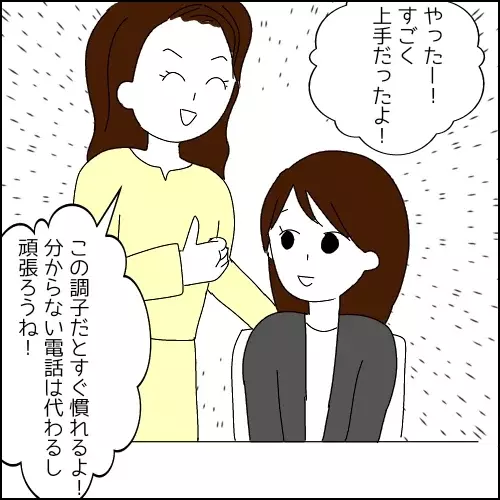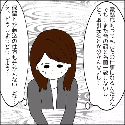 「私も頑張らなきゃ」とPCに向かう一さんでしたが、オフィスに鳴り響く電話にヒヤッ。「取引先も分からない」「保留の仕方も分からない」と不安でいっぱいになる姿、新入社員あるあるすぎて胸がキュッとなります。でもちゃんと自分から先輩に「電話取っても大丈夫ですか?」って聞きに行けるの、偉すぎませんか……!?