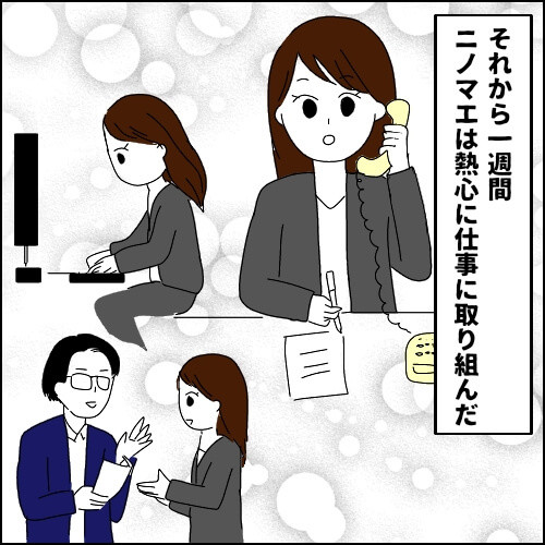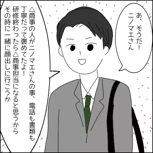 そして一さん、一週間、電話対応も書類もコツコツ頑張った結果、ヨシダさんから「△商事の人が褒めてたよ!」という嬉しい報告が。よかった、よかった。見ている人は見ているものですね。