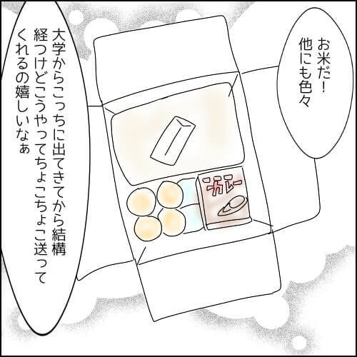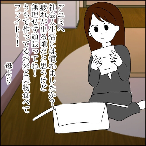 ぐったり疲れて帰宅した一さんを迎えたのは、お母さんからの仕送り。お米に果物にカレー、そして手紙。「疲れが出る頃だと思うけど無理せず頑張ってね!」って……泣かせにきてますよね!? 一人暮らしの新社会人にとって、実家からの荷物は最強の回復アイテム。果物を持って「頑張るよお母さん」の一さんに、こっちまでうるっときました。