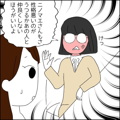 しかも「性格悪いのがうつるからあの人と仲良くしないほうがいいよ」って、ええええ〜小学生女児かい!仲間はずれ作戦ですか?って、今どき小学生でもやらないかもしれません。
