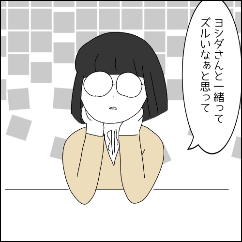 そして本音がポロリ。「いいなぁ〜 私も一緒に行きたいなぁ〜」……いや、外回りは遊びじゃないんですよ?しかも「ヨシダさんと一緒ってズルいなぁ」って、仕事をなんだと思ってんだ!