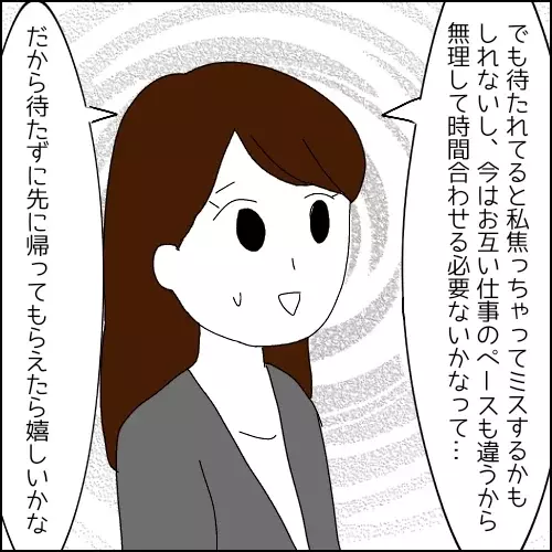 「待たれてると焦っちゃってミスするかもしれないし」「お互い仕事のペースも違うから無理して時間合わせる必要ないかなって」「先に帰ってもらえたら嬉しいかな」——おおおお! 一さん、ちゃんと自分の言葉で気持ちを伝えた……!! 相手を傷つけないように配慮しつつも、しっかり「NO」を言えている。これは成長ですよ……!