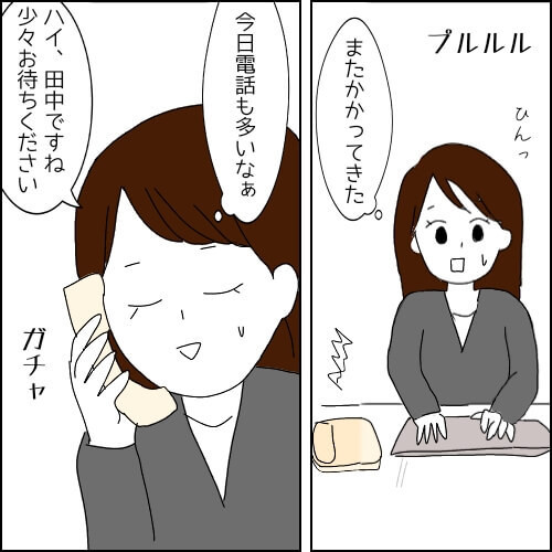 この怒涛の電話ラッシュの中、佐々木さんは……目の前で電話が鳴っているのにスルー。いやいやいや、一さんがあんなにバタバタしてるの見えてますよね!? 先輩に「そろそろ電話取ってみようか」と言われてからどれだけ経ったんですか……!マジ、仕事しよーよ。