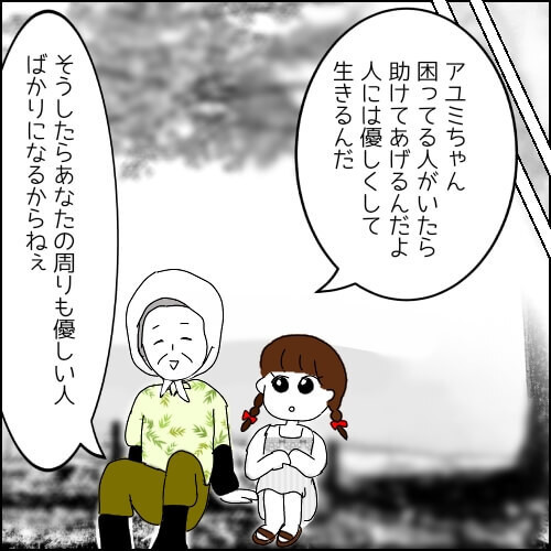 一方、一さんは幼い頃を回想ーーおばあちゃんが幼いアユミちゃんに「困ってる人がいたら助けてあげるんだよ」「人には優しくして生きるんだ」と語りかける場面、じーんときますね。「アユミ優しい子になるね」って約束する幼い一さんがかわいすぎて泣ける……! 一さんの「優しさ」の原点がおばあちゃんの教えだったんですね。