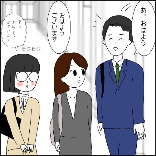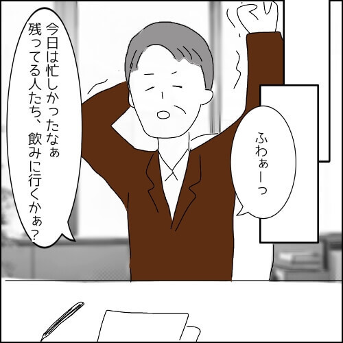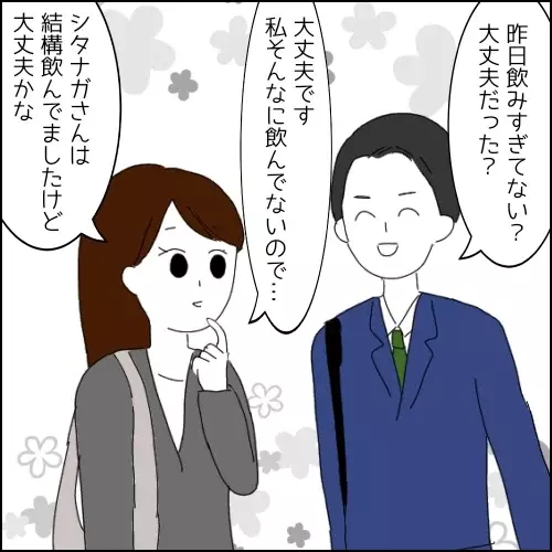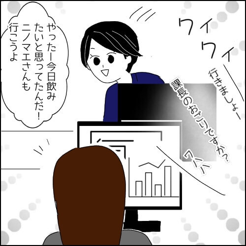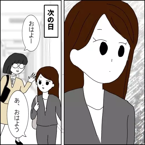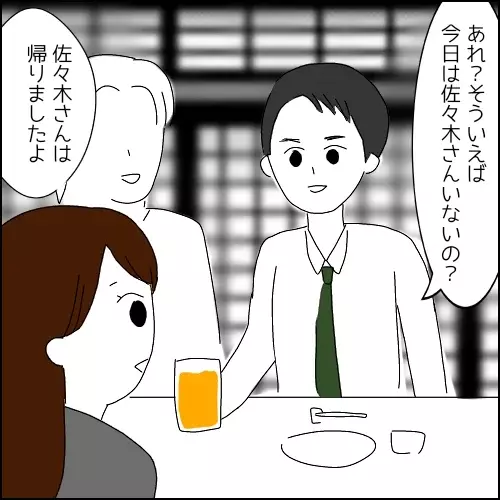そして翌日。佐々木さんと出勤中に会い、そこへヨシダさんが「昨日飲みすぎてない?」と声をかけてくる展開。一さんとヨシダさんが「飲み会の話」で盛り上がる横で、佐々木さんの表情が……。自分だけ誘われなかった飲み会の存在を、目の前で知ってしまったわけです。