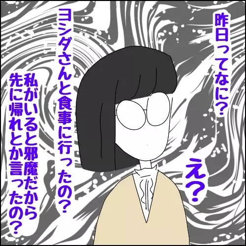 さて、その日は忙しかったのかフロアーに残業勢がちらほらいて、課長の一声で飲みに行くことに。問題はその翌日。朝、佐々木さんと一さんが一緒のところに、佐々木さんの憧れのヨシダさんの「昨日飲みすぎていない?」というひと言が佐々木さんの心をかき乱したのでした。