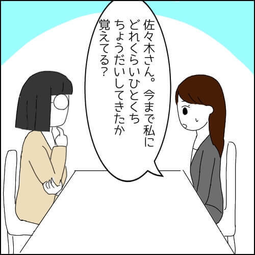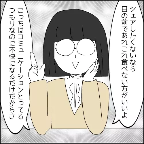 さらに佐々木さんの謎ロジックが続きます。「嫌だって言えばいいのに〜」「シェアしたくないなら目の前で食べない方がいいよ」「こっちはコミュニケーションとってるつもりなのに不快になるだけだからさ」——もう、開いた口が塞がらないとはこのこと。被害者に「お前が悪い」と責任転嫁する加害者そのものの理論ですよ! 漫画担当も怒りで震えています。