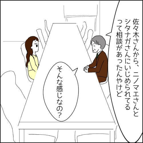 果たして何を話したのか……ってそれは、課長がすぐにゴトウさんを呼び出したのでわかりました。課長から告げられたのは「佐々木さんから、ニノマエさんとシタナガさんにいじめられてるって相談があったんやけど」という衝撃の一言。