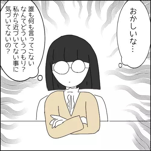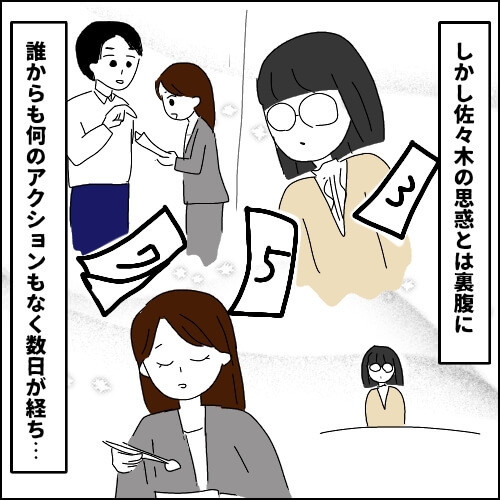 しかし数日経っても誰からも何のアクションもなし。「おかしいな…誰も何も言ってこない。なんでどういうつもり?私から近づいていないのに気づいてないの?」と不満顔の佐々木さん。……いやいや、気づいてないんじゃなくて、距離を置かれてるんですよ佐々木さん!
