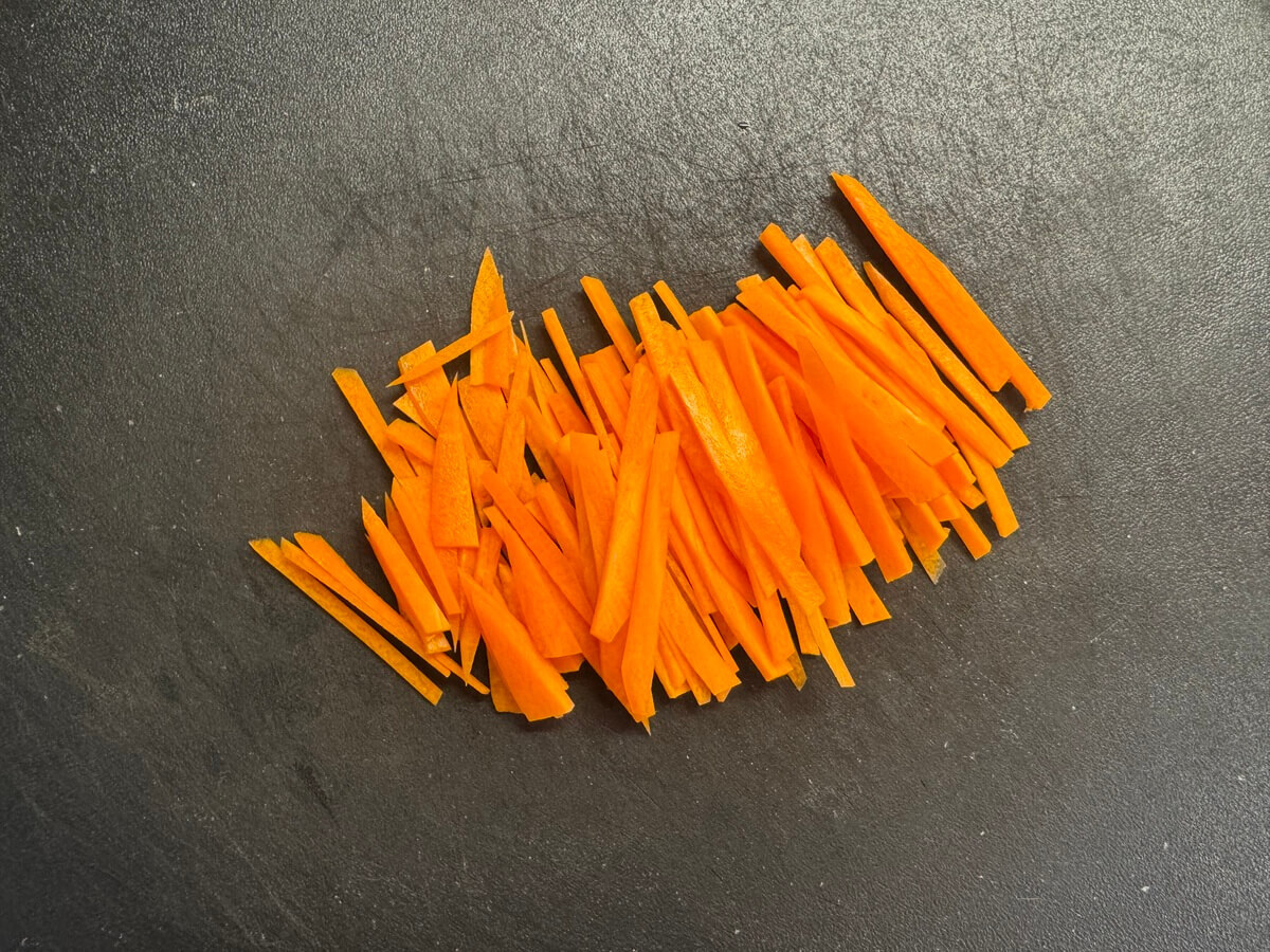にんじんは皮をむいて千切りにします。