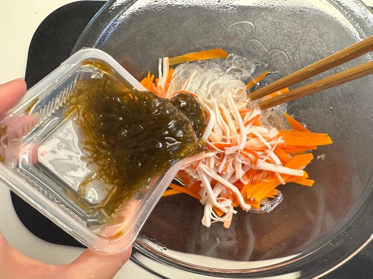 作り方③もずく酢、カニカマ、しょうゆ、ごま油を加えて混ぜる