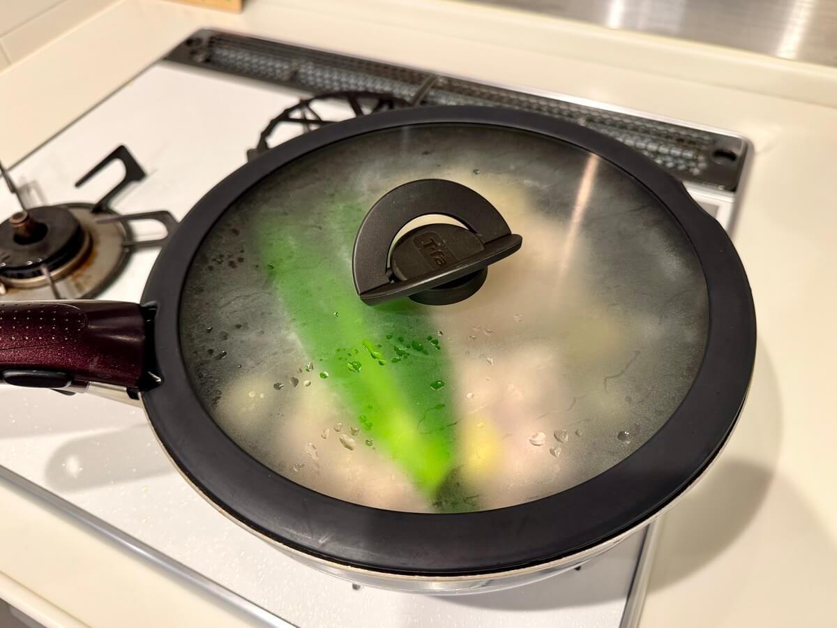 水の量がかなり多いので、深さのある鍋やフライパンがおすすめです。筆者は深めのフライパンを使用しました。