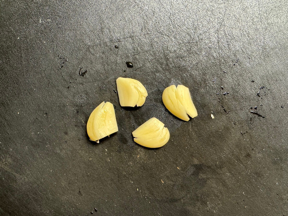 にんにくは皮をむいて芯をとり、包丁でたたきます。