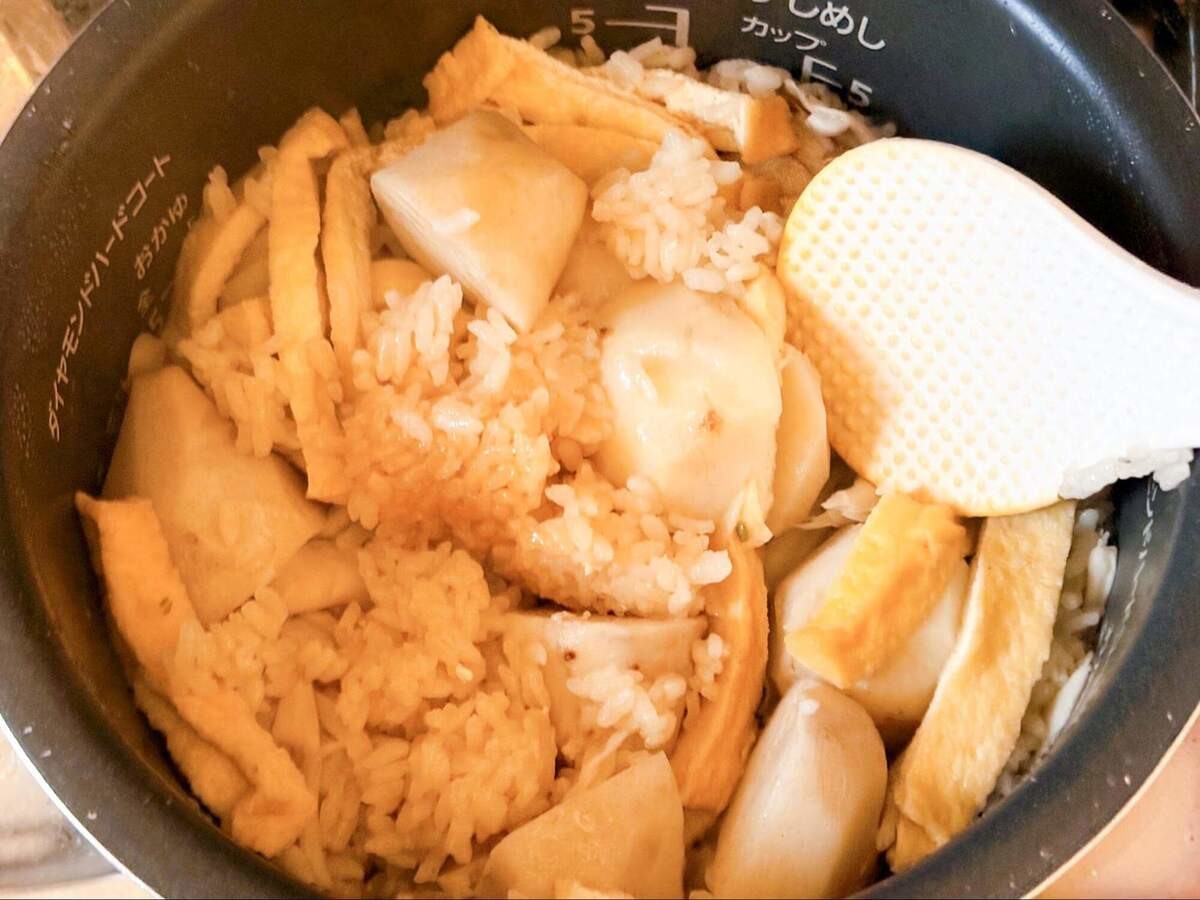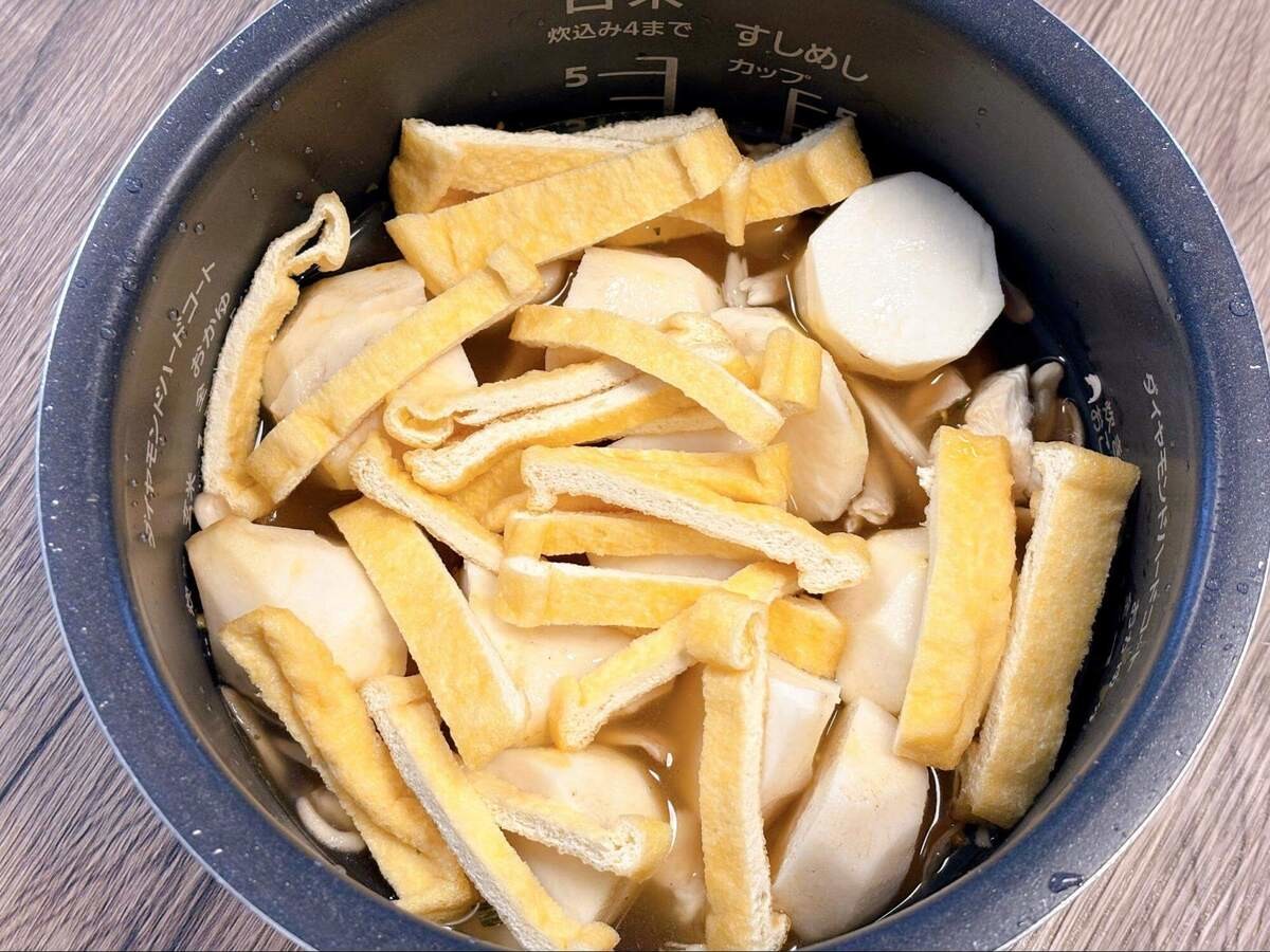 里芋・油揚げ・まいたけを加えて軽く混ぜ、炊飯器の通常モードで炊きます。