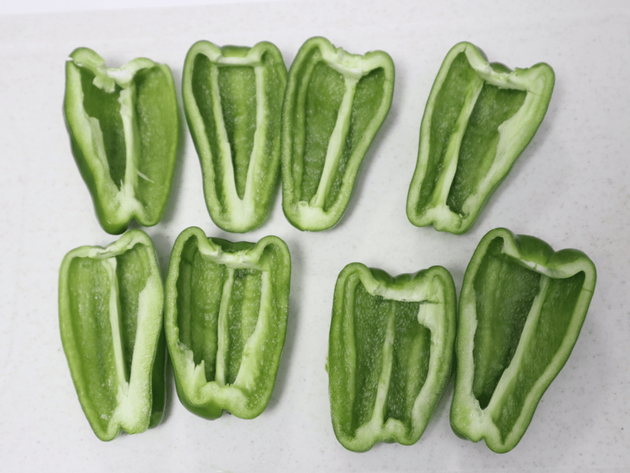 ピーマンは縦半分にカットし、種を取り除きましょう!