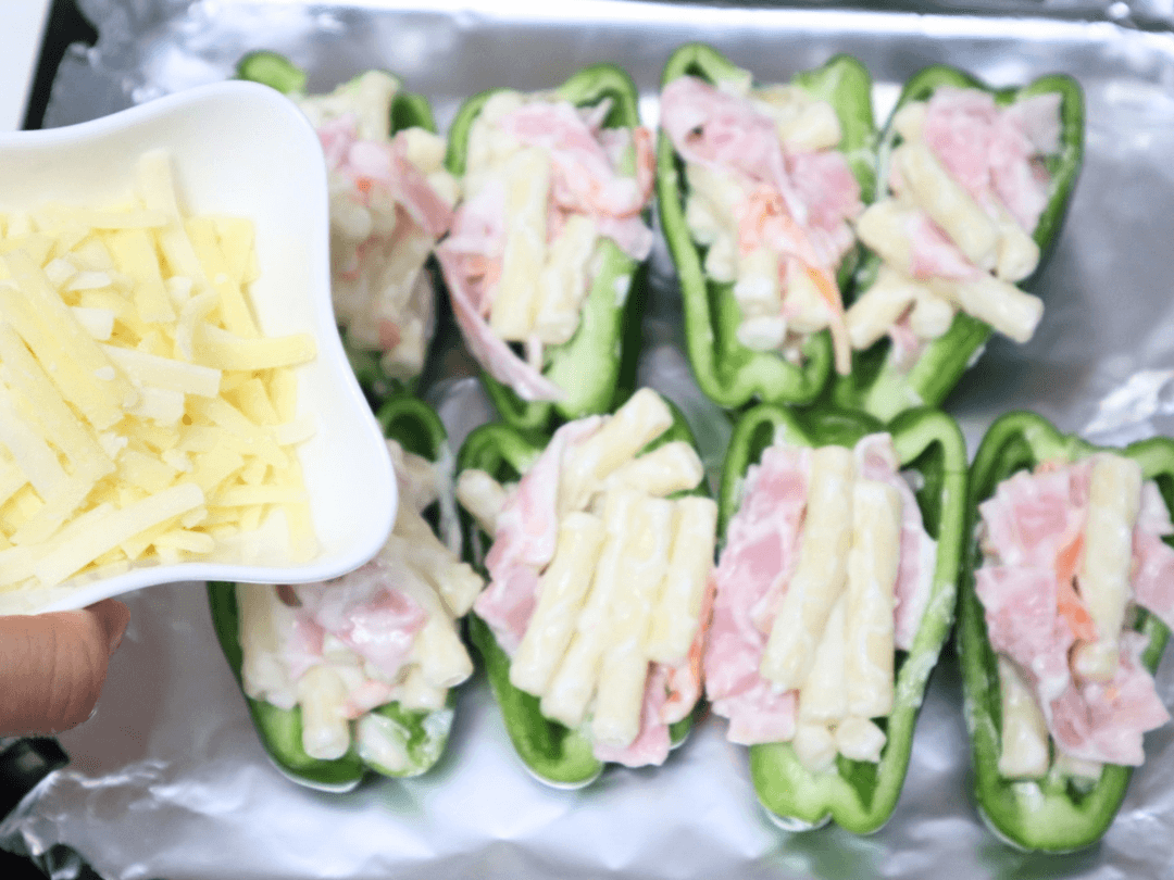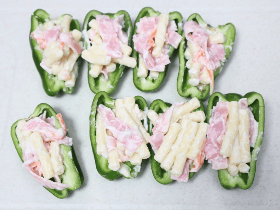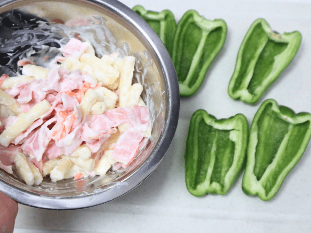 先ほど切ったピーマンに、ベーコンを混ぜたマカロニサラダを詰めましょう!