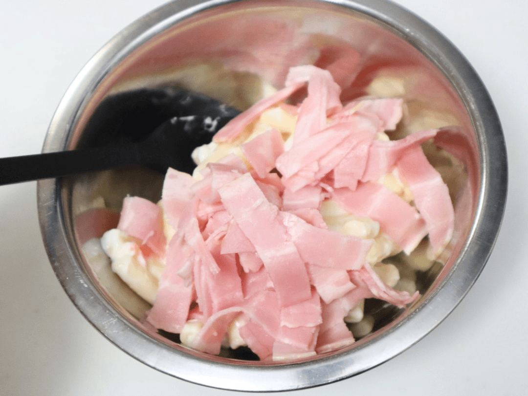 作り方②マカロニサラダにベーコンを切って混ぜる